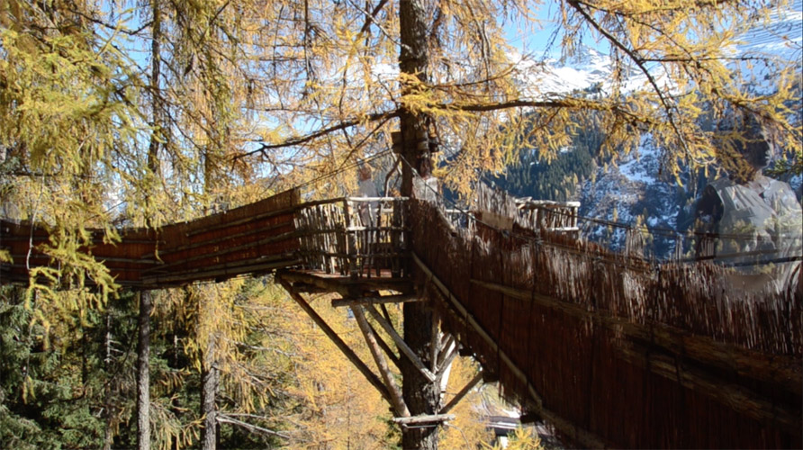 bridge is elevated between seven trees in the Austrian Alps. It is